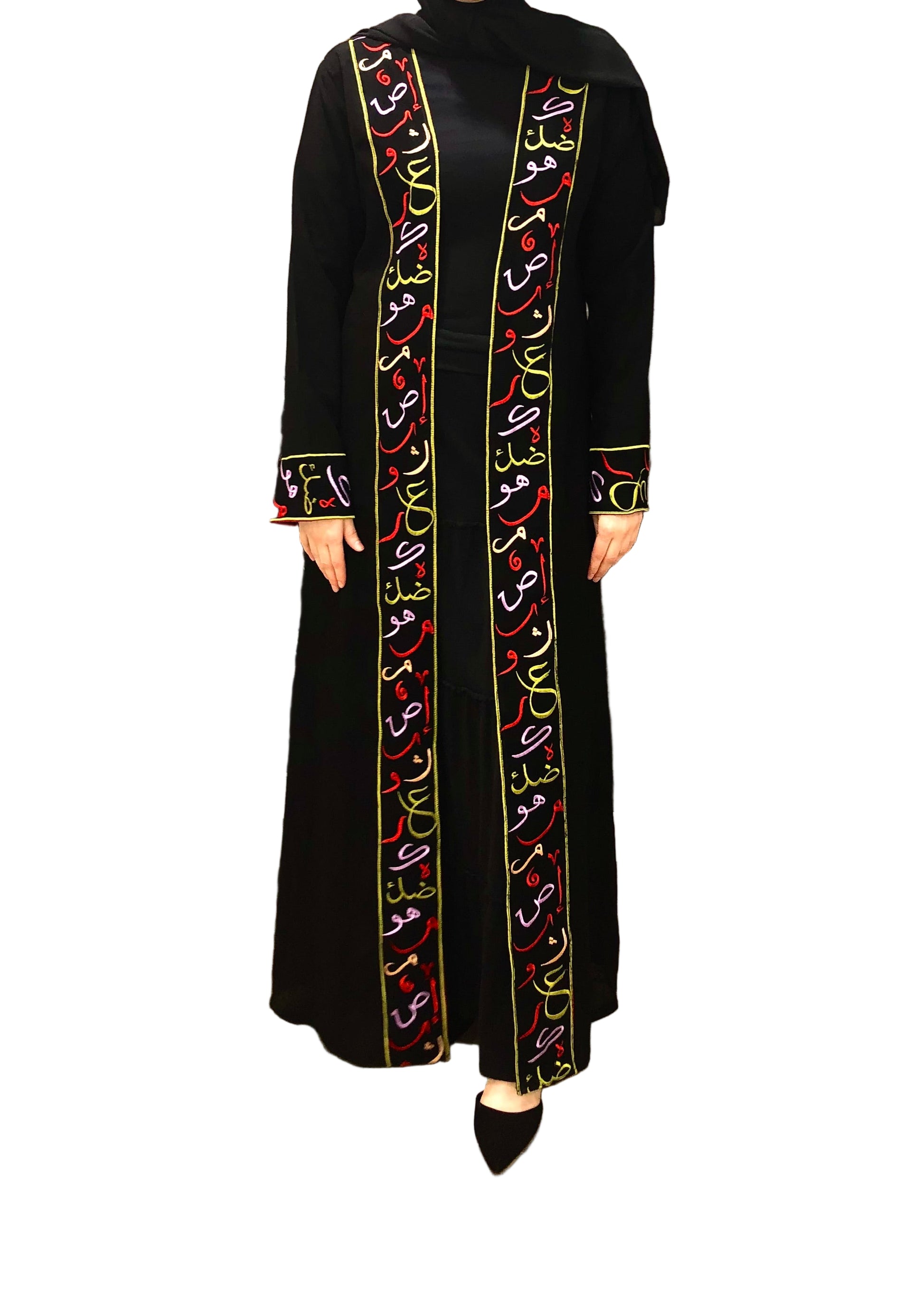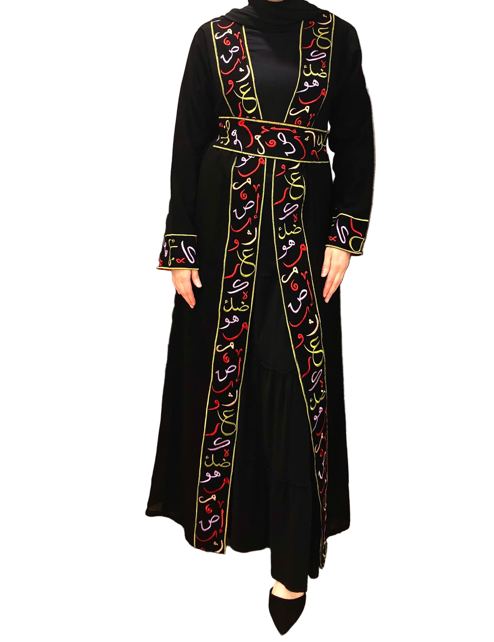 Elevate your wardrobe with this Arabic Alphabet Tatreez Abaya, featuring exquisite multi-color embroidery on a classic black fabric. The open design paired with a matching belt offers both elegance and versatility, making it perfect for any occasion. Experience the blend of traditional artistry and modern style in one stunning piece.
