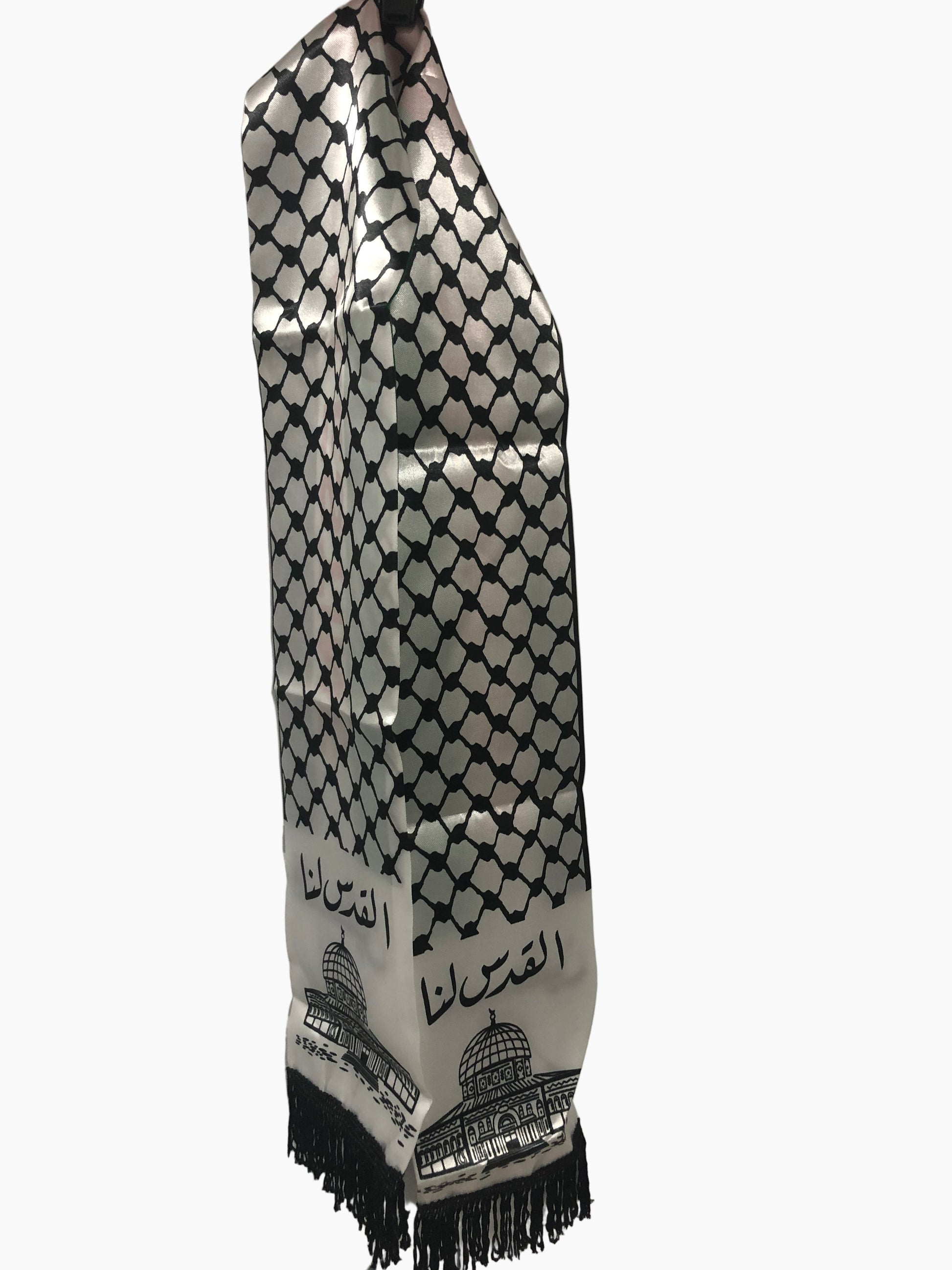 Wrap yourself with the Palestinian Scarf featuring the iconic Dome of the Rock alongside the vibrant Palestine flag. This scarf not only adds a meaningful touch to your outfit but also symbolizes cultural identity and solidarity. Crafted for comfort with its light fabric and style, it’s perfect for daily wear to express your connection to Palestine. Make a statement with this unique accessory.