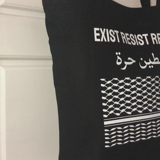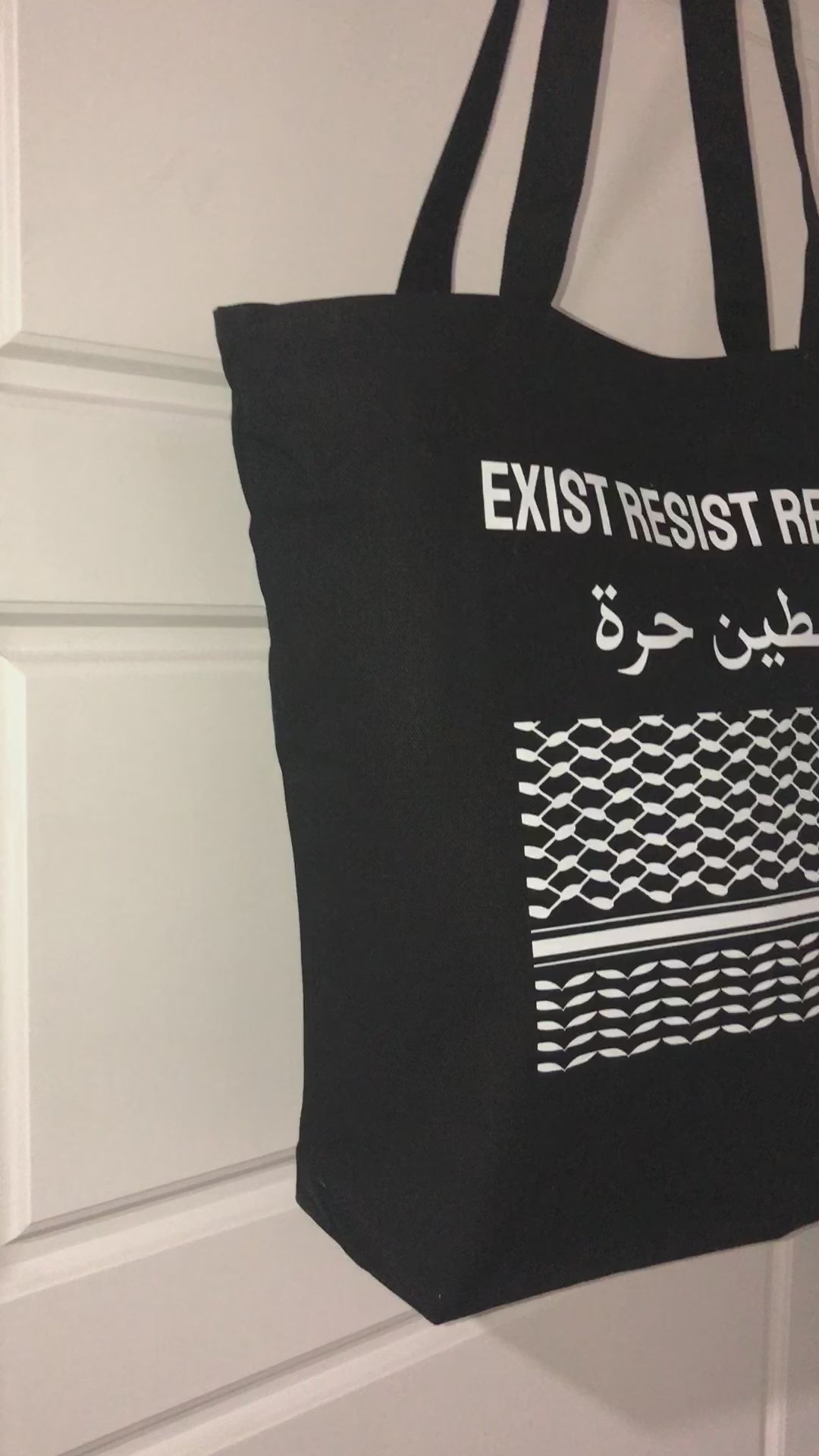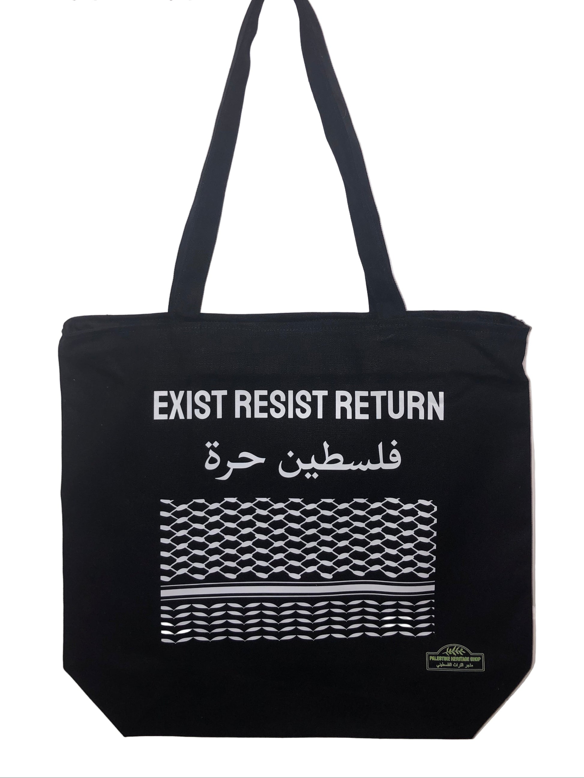 Carry your essentials in style with the Travel Kuffiyeh Zipper Tote. Featuring a classic kuffiyeh pattern, "Free Palestine" written in Arabic and the powerful message "Exist Resist Return", this tote combines cultural pride with practical design. The secure zipper closure and interior zipper pocket keep your belongings safe and organized, making it perfect for travel or daily use. Embrace a meaningful accessory that supports a powerful message wherever you go.